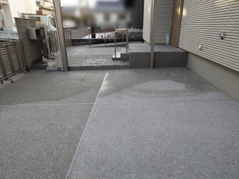 ガレージ土間はすべてジャミコン洗いだしと致しました。もちろん、通常の生コン打ちよりは割高にはなってしまいますが、見た目もいい感じです。さらにタイヤの跡が縦横無尽に付かなくなり、汚れ対策もバッチリです。アプローチはユニソン カッシアを施工。土間仕上だけでは変化がないので、アプローチには変化をつけた感じです。