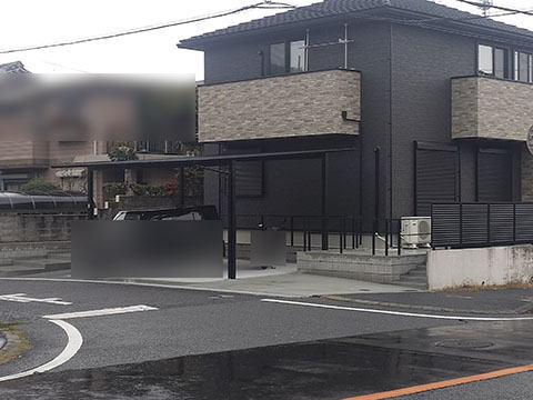駐車場が縦に2台分駐車可能なガレージ。建物周りは砕石敷き、ガレージ部には1台プラスαのカーポートを施工しました。右側には植栽スペースを設けました。ミモザとオリーブを植栽。景石も並べて良い感じになりましたね。新築の色を合わせて黒を基調にした渋めの外観となりました。