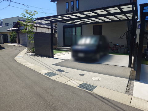 縦列にカーポートを施工する場合はこの逆勾配仕様も家側に雨が流れないので積極的に採用しても良いかもしれませんね。門柱は本物の枕木に見える東洋工業のレイルスリーパーラフト、ポストはボビポストを、さらにガレージアプローチはキューブ型ピンコロを使用。豪華な仕上がりとなりました。