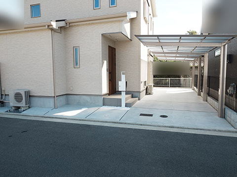 3階建ての新築にて外構工事を施工しました。今回はぐるりすべて生コン打ちで施工。完成後はすっきりした感じになりましたね。機能門柱も家の扉と同じカラーにすることも出来ましたので、デザイン的にもいい感じに仕上がりました。