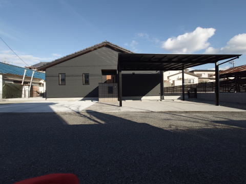 1台分カーポートに3,4台は駐めれそうなガレージを新設。ガレージの奥には人工芝、タイルテラスも施工。物置も施工しています。物置は左側に自転車を置けるタイプで、大きな物置でした。真裏の勝手口横には洗濯物が干せるテラス屋根も新設しました。