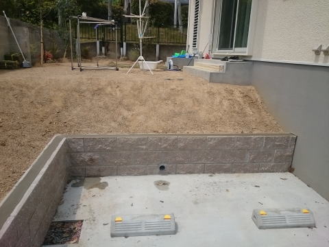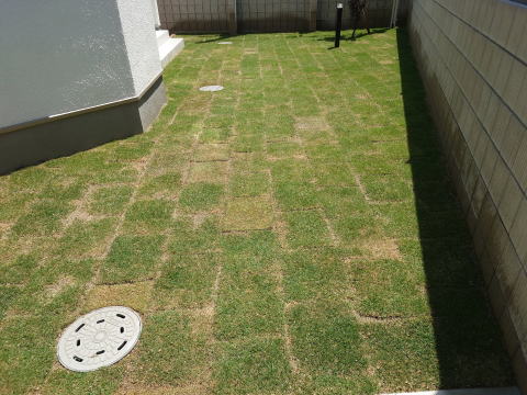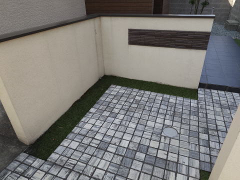 土を均してその上に防草ソートを貼って人工芝を施工。緑が綺麗で近年人気がある外構仕上。なんといっても人工芝の質が格段に上がりましたね。原産地は主に中国、ベトナム。国産もありますが、価格は倍になります。メリット:緑が綺麗で子供も遊べる人気の仕上。下地さえ綺麗に均せばDIYでも施工可能。 デメリット:真夏は素足は危険。暑くなります。あとは耐久性がどのくらい持つか。ちなみに弊社での施工は約10年以上と、すでに実績はありますが、未だに朽ち果てて交換の依頼は無いです。バーベキュー不可! |