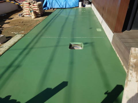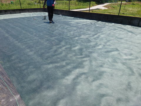 土を均してその上に防草ソートを貼って人工芝を施工。緑が綺麗で近年人気がある外構仕上。なんといっても人工芝の質が格段に上がりましたね。原産地は主に中国、ベトナム。国産もありますが、価格は倍になります。