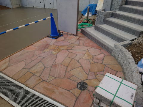 ![]() 石材をパズルのように組み合わせて貼っていく仕上。乱型貼はパターンが無く、ひたすら目地を合わせて切って行き、仕上げていきます。色もある程度は種類があります。原産地は中国、ブラジル、インド、色によって産地が変わる。 メリット:洋風には合う仕上。色合いが綺麗でアプローチの入り口に施工すると良い。 デメリット:やはり価格が高い。㎡単価は2万はします。 |