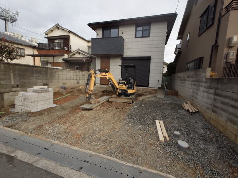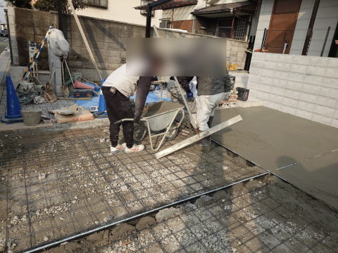 ガレージ土間コンクリート打ちの様子。今回はお客様が先に引っ越しして来るために先に土間コンクリートを施工しています。この後、仕上げ工事のタイル張りを施工していきます。塀と、アプローチにタイル、通路にはユニソンカッシア(インターロッキング)を施工します。