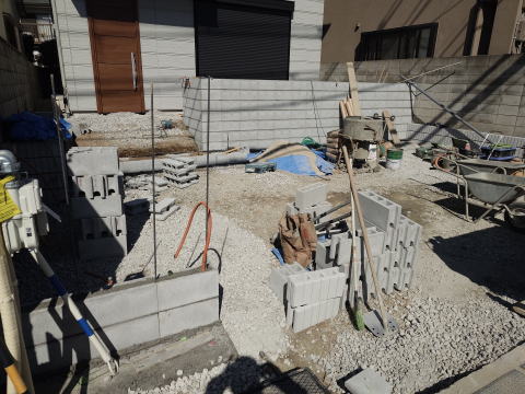 この後、奥にテラス造りの為のCB積み、左側には門柱のCB積みを施工していきます。