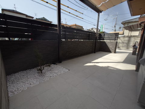 タイルは玄関と同じリビエラタイルを使用。フェンスもまだ最近出たカラー、クリエダークを採用しています。(もちろん初採用)植木は10年経っても1mくらいしか伸びない「プンゲンストウヒ」を植栽。特に剪定の必要も無いので手入れは非常に楽ちんなんですよね。お客様もすでにバーベキューセットも購入されており、そろそろバーベキューの季節なので、早速楽しまれるのも良いですよね。いやぁ、うらやましい。