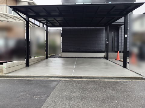 LIXIL フーゴF2台用の取付工事をしました。屋根ポリカが新発売のブラックマットポリカ。発売当初はかなりの人気商品でしたので、数ヶ月お待ち頂いての施工となりました。ガレージ土間も施工して、新築のブラック基調とマッチして、良い感じに仕上がりましたね。しかしこのブラックマットポリカ、実物はなかなかかっこいいですよ。