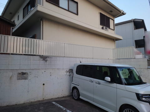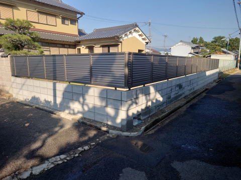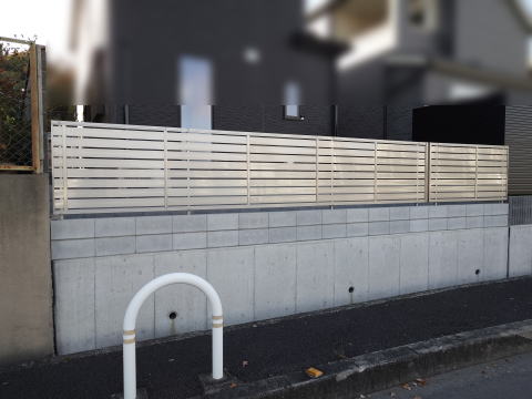 擁壁の上にCB1202段を追加。その上には横スリット高さ1mのフェンスを取り付けました。以前はメッシュフェンスでしたが、コンビニが目の前にあり、目線が気になるので目隠しフェンスを希望されました。高さも高くしたので中はほぼ見えなくなりましたね。