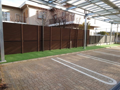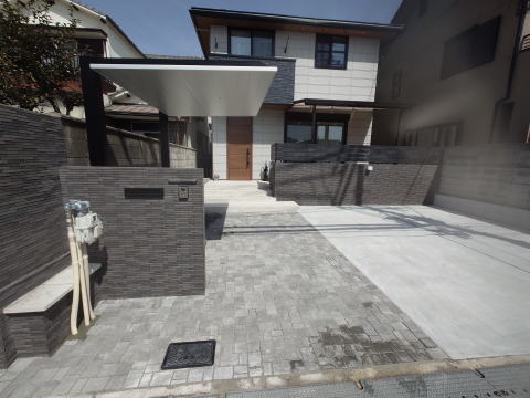 リブブロックはユニソンの新製品、タウラプラスを使用。黒色に雨を弾くような加工がなされており、1枚あたりはかなりの高額なリブブロックですが、独特の雰囲気を醸し出してますね。手前はすべて車庫スペースに、お子様の遊び場は人工芝を敷きました。