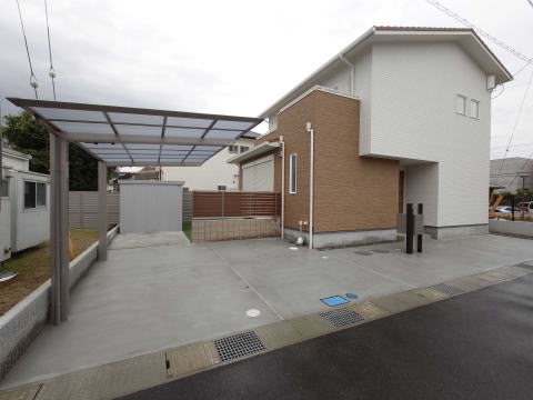 閑静な高級住宅街に佇む新築一戸建て。今回はタイルをふんだんに使用して、見た目を豪華にしています。車もなんとか3台停めることが可能です。テラス中もすべてタイル張りを、サイクルポートにはLIXIL