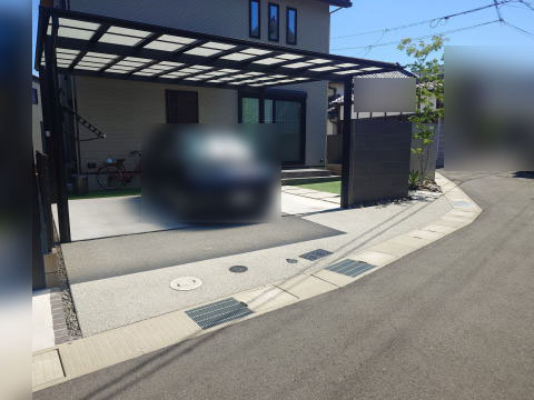 新築購入時には左側が砂利敷きだったためにガレージを新設。コンクリートを打って隙間には人工芝を敷き、カーポートも新設しました。