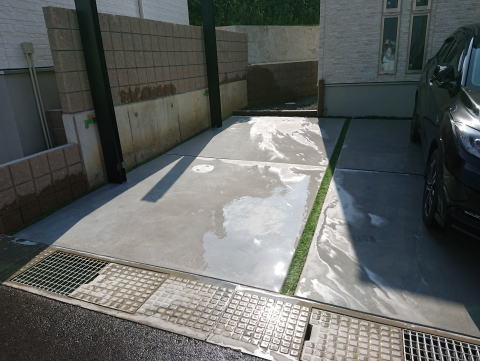 ガレージ手前側にはジャミコン洗い出し仕上げを採用。左側は掃き出し窓の目隠しとなるブロック塀を新設し、裏側には人工芝を施工しました。