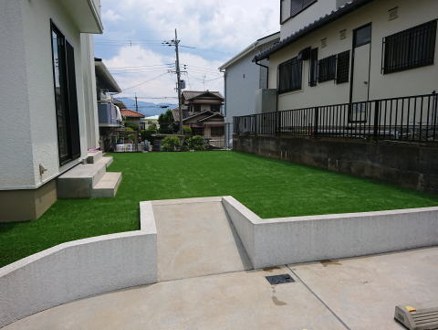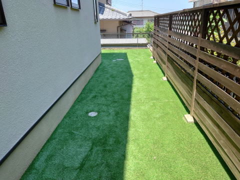 真砂土敷きの範囲が結構広くて、草むしりが大変とのことなので、すべて人工芝にしました。この人工芝は今流行りになってまして、1年のうちに結構な数の現場に施工しています。人工芝を張ると、見た目も綺麗になるし、草抜きの労力から解放させるのでお勧めですよ。