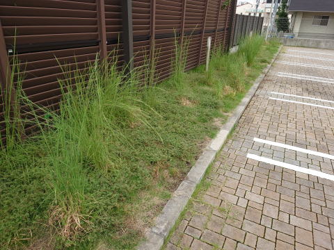 元々は高麗芝を貼ってたんですが、すでに草が勝ってしまい、芝生の面影はありません。草刈りをすればある程度は綺麗にはなるんですが、これだけ草が勝ってしまうと、すでに手遅れ。刈り込んでもすぐに草が出てきてしまいます。芝生の管理は綿密な草抜きが必要です。今回は草刈りをして人工芝を施工します。