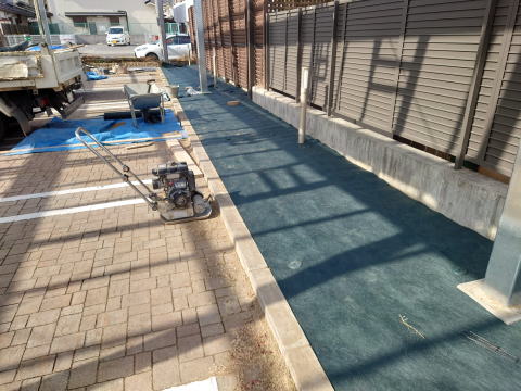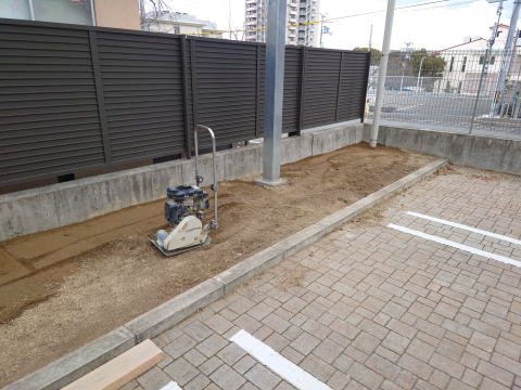 草刈りのあと、高さ調整用に真砂土を敷きならします。その後、転圧機で押さえて足で踏んでも凹まないようにします。このように、人工芝の施工は最初の地ならしが重要です。