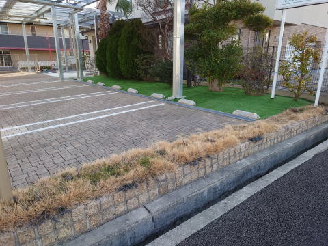 完成の写真。植木の下が若干難儀しましたが、うまく施工できました。やっぱ人工芝は色がいいですよね。しかも案外長い期間、この状態を持続します。草に難儀している場合はこの人工芝の施工をお勧めしますよ。