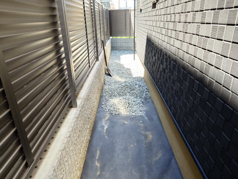 掘削工事と並行して防草シート敷き、砕石敷きも施工していきます。造成地でしたので家の周りは大方綺麗に均されてる状態でしたので、すぐに防草シートを敷ける状態でした。砕石は2トン車1台分を搬入しました。