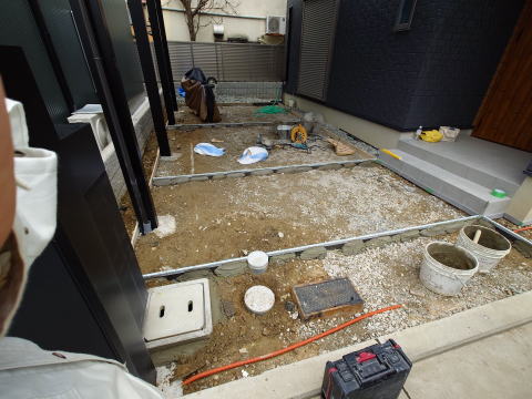 転圧もやっておけば歩きやすいですね。この後はカーポートの工事がありますので、少しの間はこのままの状態にしておきます。