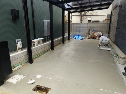生コン打設後の様子。左官屋さんが綺麗に均してくれてます。当社では左官工事は左官屋さんを呼んでます。今回は刷毛引き仕上げで土間を仕上げます。この仕上げだと、タイヤの跡が分かりにくくなるんですよね。跡が気になる人にはお勧めの仕上げ方法です。