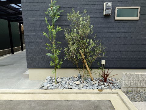 植栽スペースには揖斐石を使用、右側はドラセナを植栽し、赤色を入れました。緑色ばっかりだと少し面白みに欠けますからね。